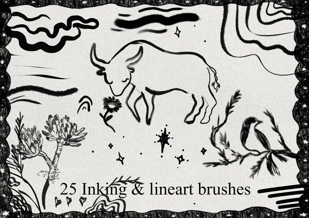 25 Lineart, Inking tecnique artbrushes for Procreate to emulate the traditional flow, pressure sensitivity and line weight that can be achieved on the traditional inking process